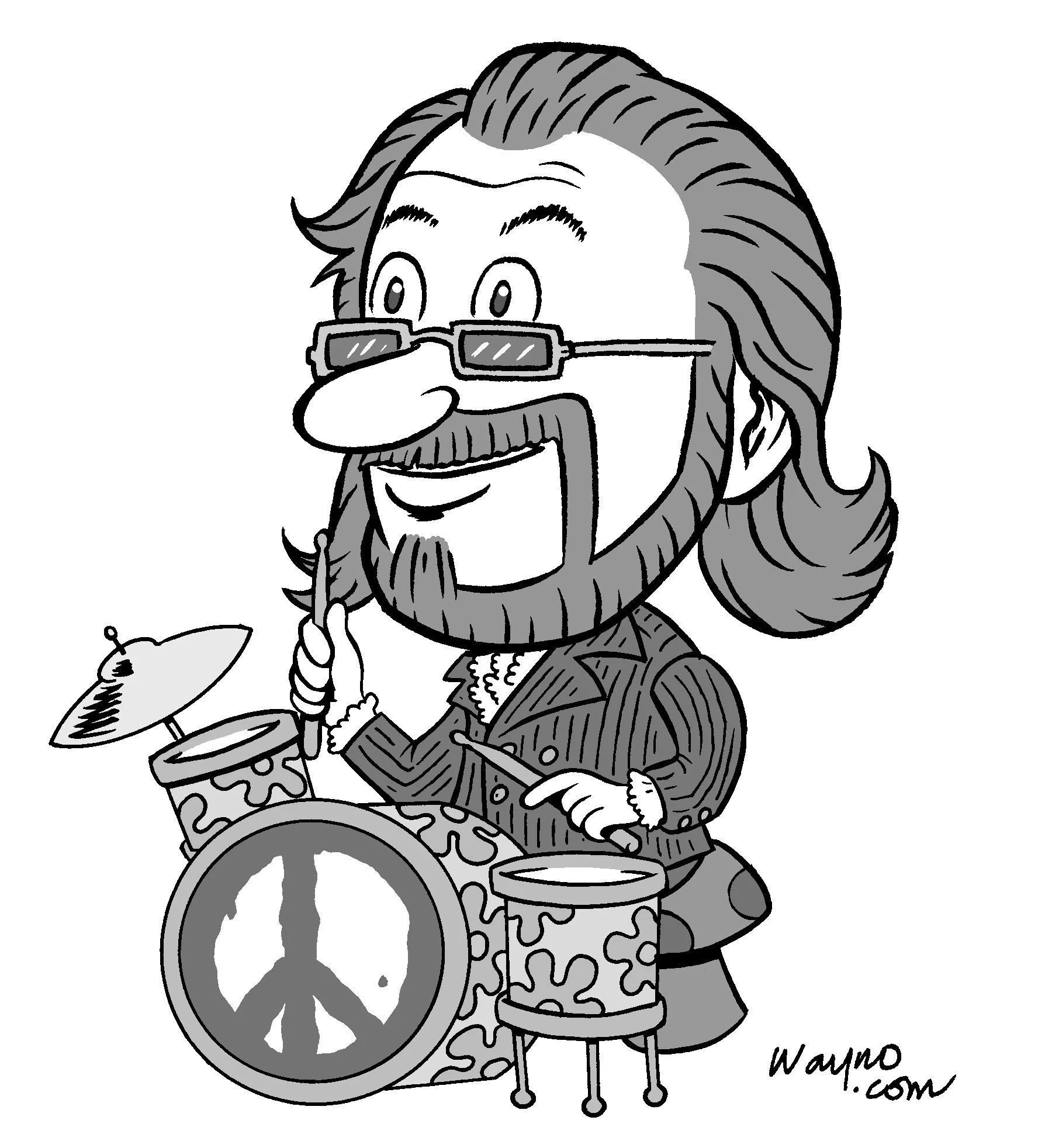 Illustration by Wayno for a column about learning to play the drums and joining a band at 40.